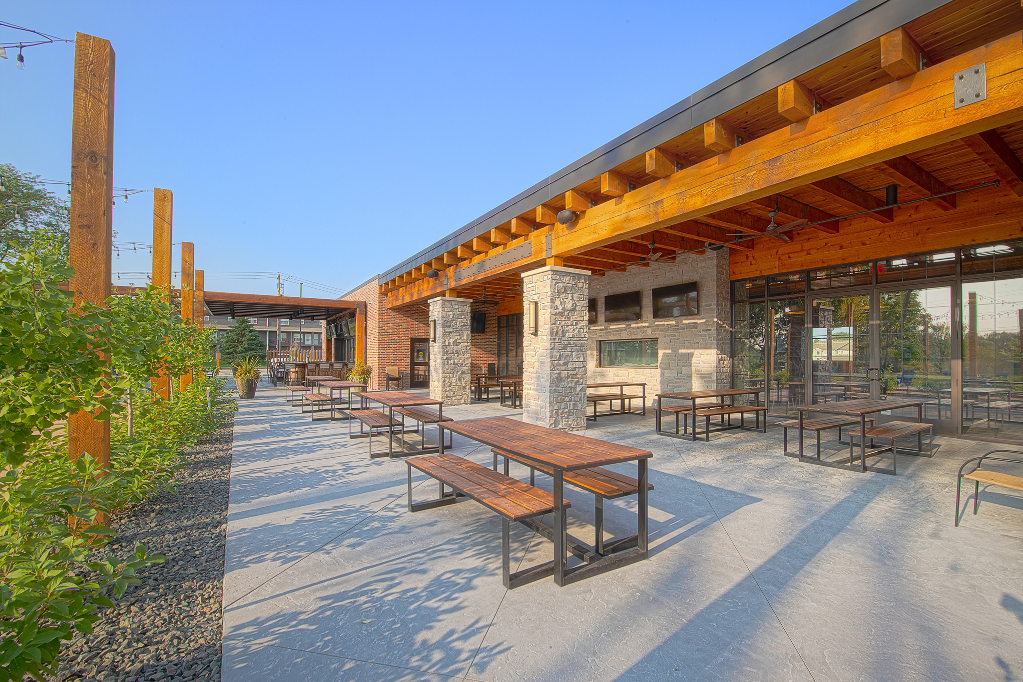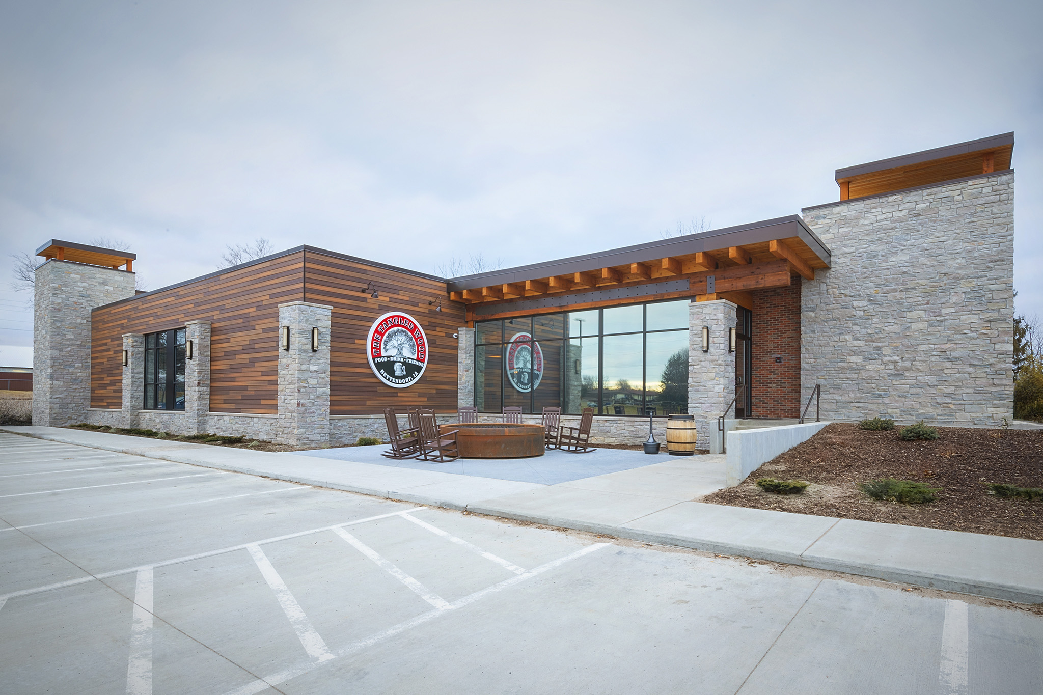 When beginning the design of The Tangled Wood, our team took a holistic approach, envisioning the property as an oasis within the city of Bettendorf. Taking advantage of the natural pines and rolling hills, the building was positioned to experience the beautiful landscape indoors and on the expansive patio.